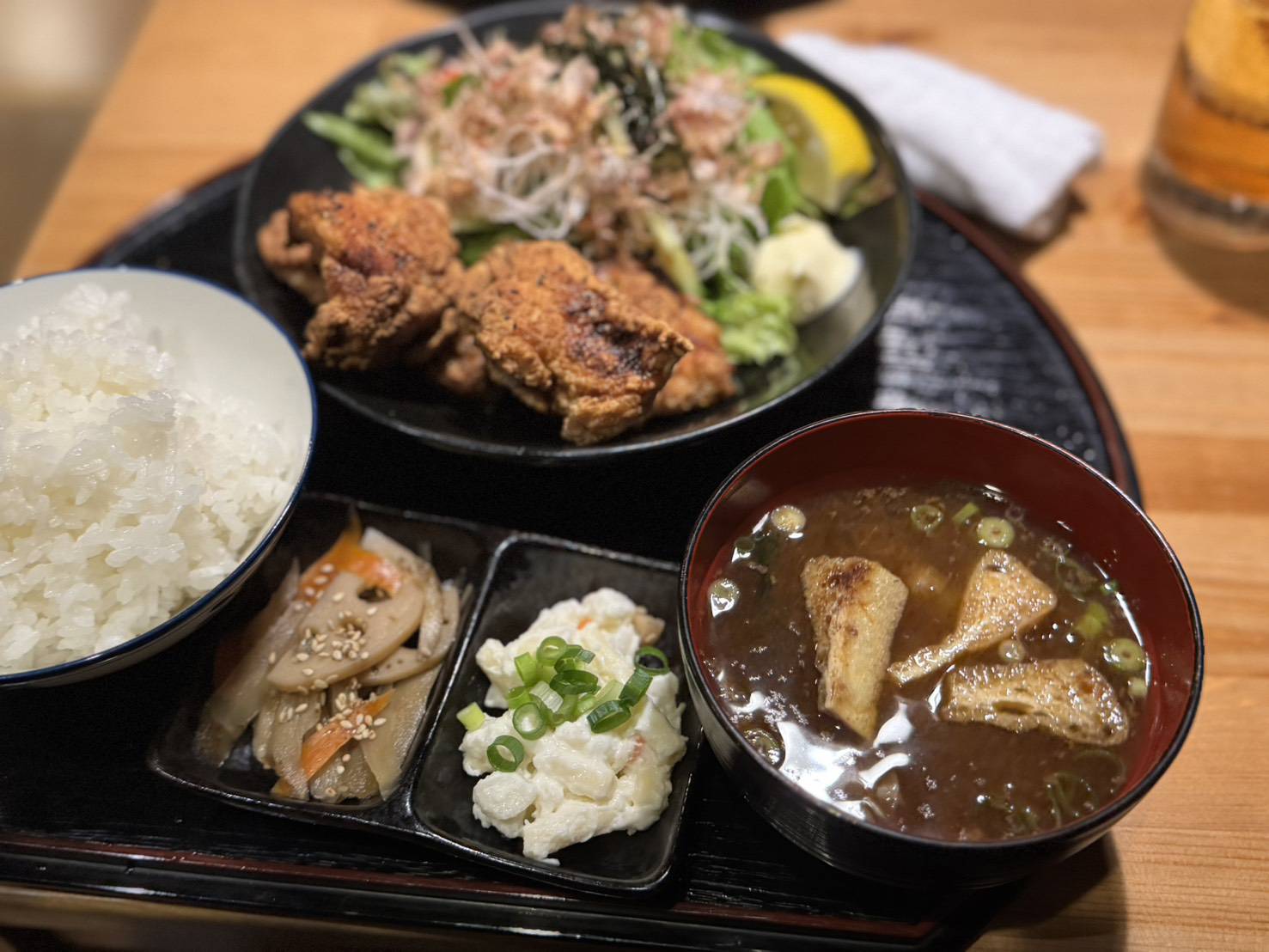 紹介してくれた方曰く唐揚げと海鮮が良いとの事だったので、私は唐揚げ定食(980円)妻は刺身定食(1,280円)を注文しました。そうして来たのがこれです。