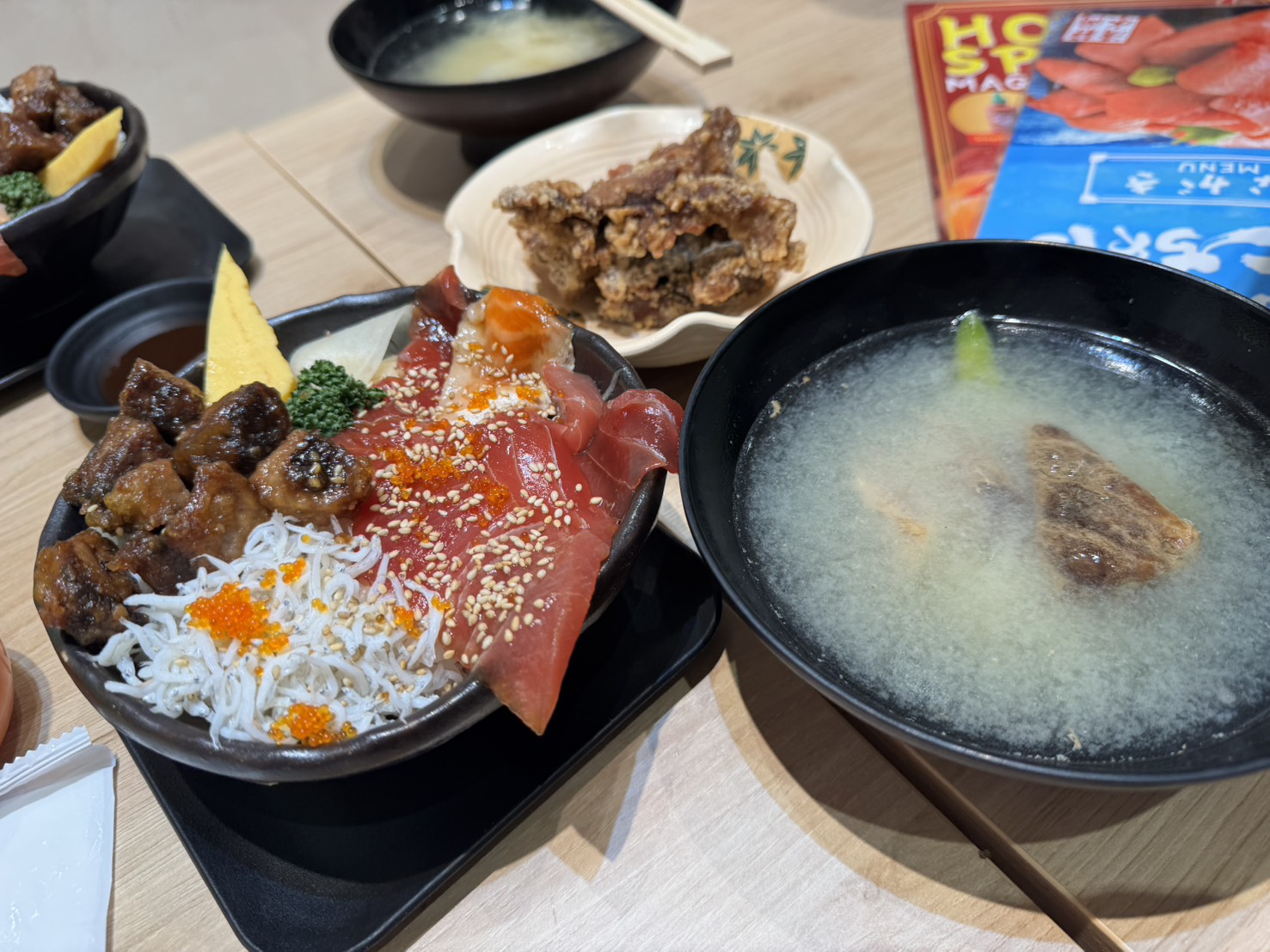 結局今回は市場館内のお店でご飯を食べました。こちらはまぐろの唐揚げとまぐろのあら汁が食べ放題のお店です。