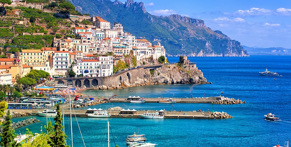 中心都市はアマルフィでカプリ島への船も発着する観光の拠点となる街。ナポリを拠点にポンペイ遺跡などとともにじっくり時間を掛けて旅したい。