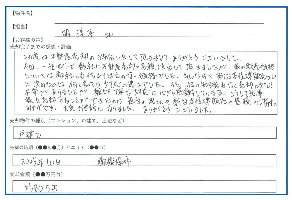 今回、一括サイトで数社に不動産売却の見積りを出して頂きましたが、家の販売価格については数社とも代わりばえのない価格でした。そんな中で新日本住建販売さんに決めたのは何と言っても対応の速さでした。また、何の知識もなく売却に対して不安がありましたが、親切丁寧な対応に心から感謝しています。こうして無事 家を売却することができたのは、担当の岡さんや新日本住建販売の皆様のご協力のおかげです。大変お世話になりました。ありがとうございました。