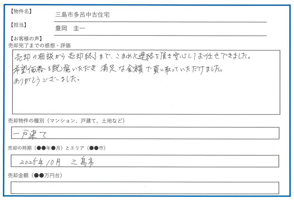 お伺いした際からお引渡し迄、柔軟なご対応をいただき誠に有難うございました。お忙しい中お引越しの調整もしていただき、スムーズにお取引が出来たことに感謝申し上げます。今後も何かお力になれることがございましたらお声掛けいただければと思いますので何卒宜しくお願い申し上げます。