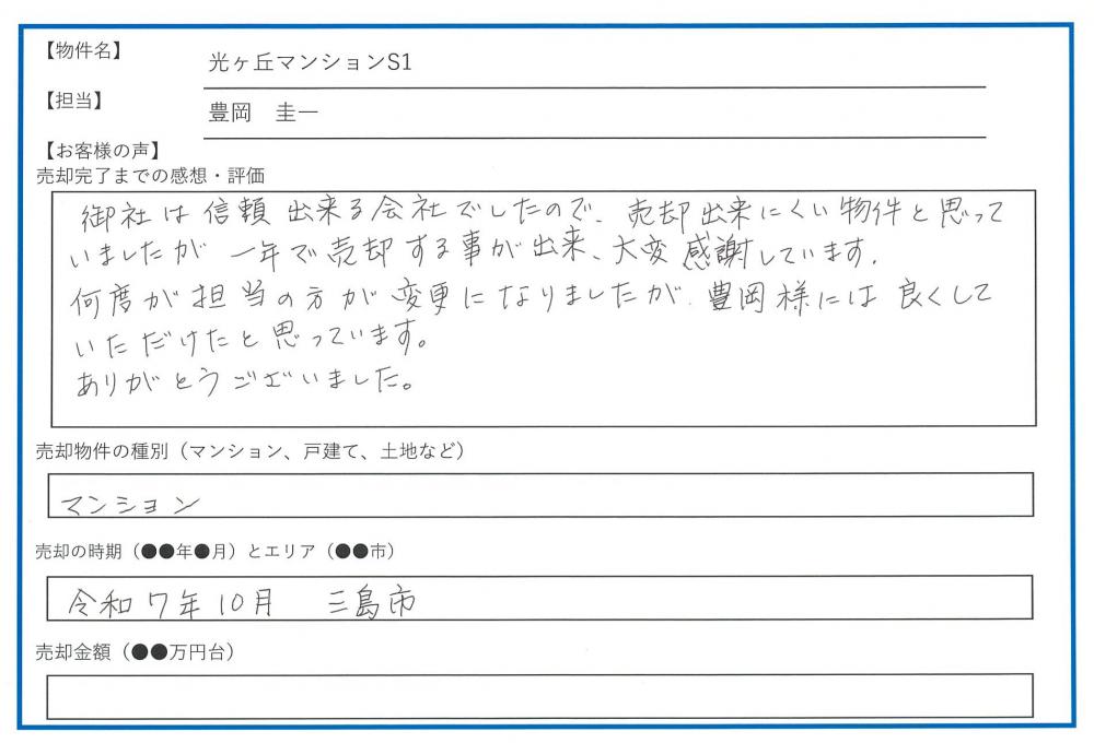 御社は信頼出来る会社でしたので、売却出来にくい物件と思っていましたが 一年で売却する事が出来、大変感謝しています。何度か担当の方が変更になりましたが、豊岡様には良くしていただけたと思っています。ありがとうございました。