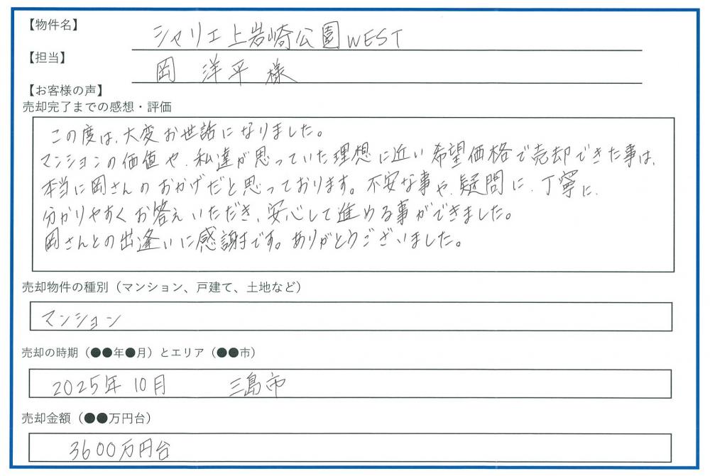 マンションの価値や、私達が思っていた理想に近い希望価格で売却できた事は、本当に岡さんのおかげだと思っております。不安な事や疑問に、丁寧に、分かりやすくお答えいただき、安心して進める事ができました。岡さんとの出逢いに感謝です。ありがとうございました。