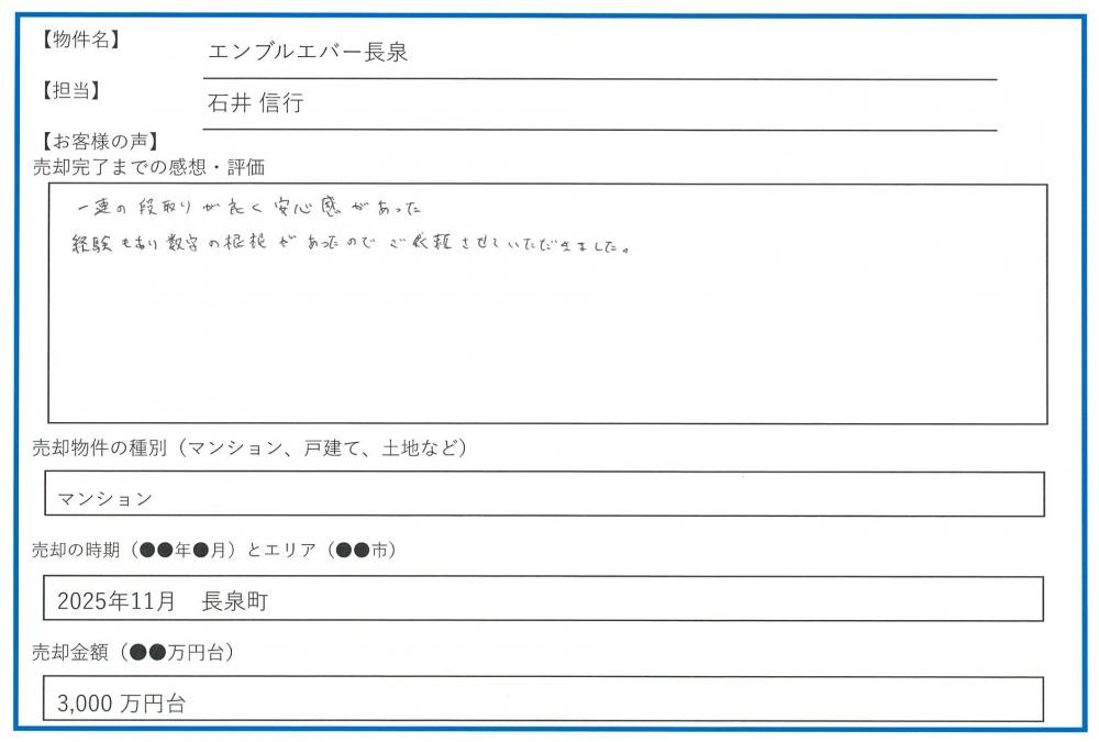 この度は、ご所有マンションのご売却契約を頂きまして誠にありがとうございました。心より御礼申し上げます。 この度は弊社に専任での売却依頼を頂き、誠にありがとうございました。本マンションもそうですが、長泉町内でのマンション仲介の実績には自信があり、期間、価格ともにご満足いく売却のお手伝いが出来たかと思います。とても綺麗に使用されていたので、お客様への印象も良かったです! 今後も不動産売買に関すること、不動産売買後で気になることございましたらいつでも対応させて頂きます。末永くお付き合いの程、宜しくお願い致します。