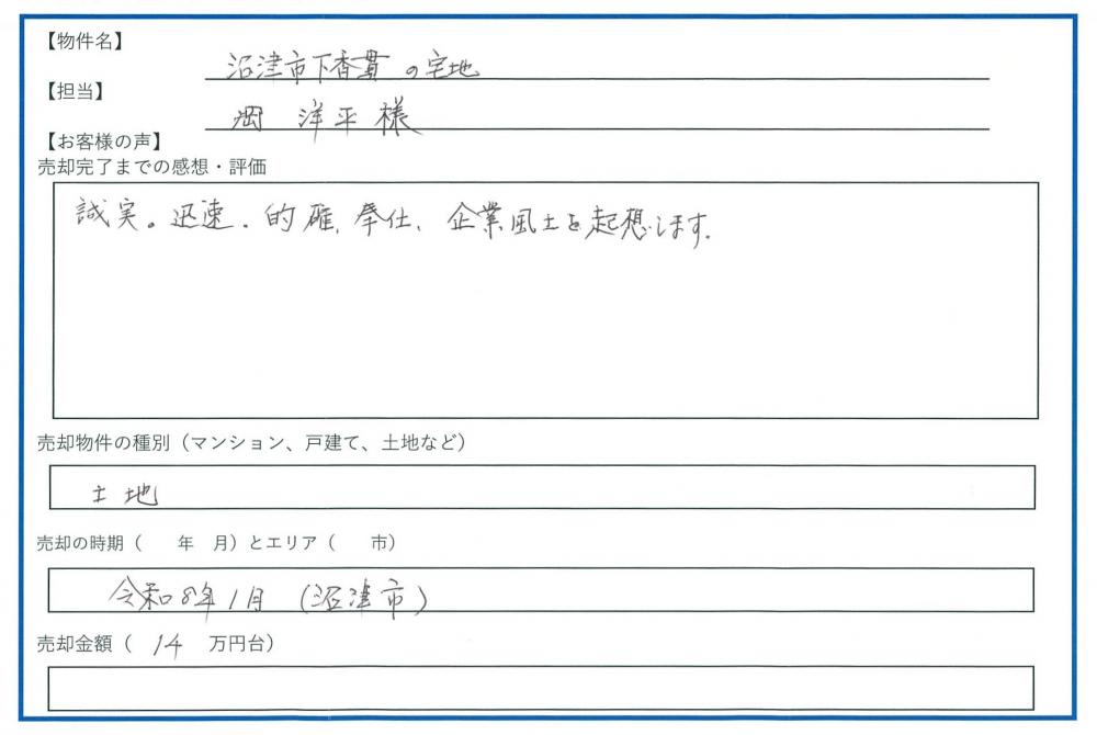 先日、無事に売買代金の決済・お引渡しが完了いたしました。これにて、土地のご売却に関するすべてのお手続き結実いたしましたこと、心よりお祝い申し上げます。