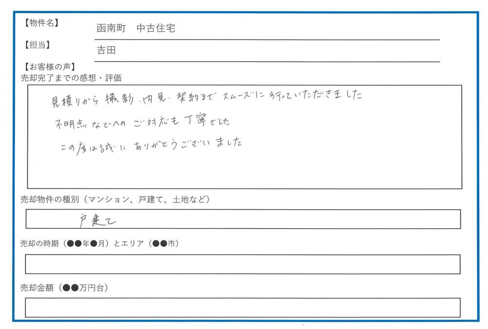 この度は、戸建てのご売却契約を頂きまして誠にありがとうございました。心より御礼申し上げます。 不動産査定サイト「HOME4U」より査定をご利用いただき、数ある不動産会社の中から、専任媒介として弊社をお選び頂きありがとうございました。 大切にご使用されてきたのがわかるお宅で早いご成約になりましたこと、嬉しく思います。 今後も不動産売買に関すること、不動産売買後で気になることございましたらいつでも対応させて頂きます。