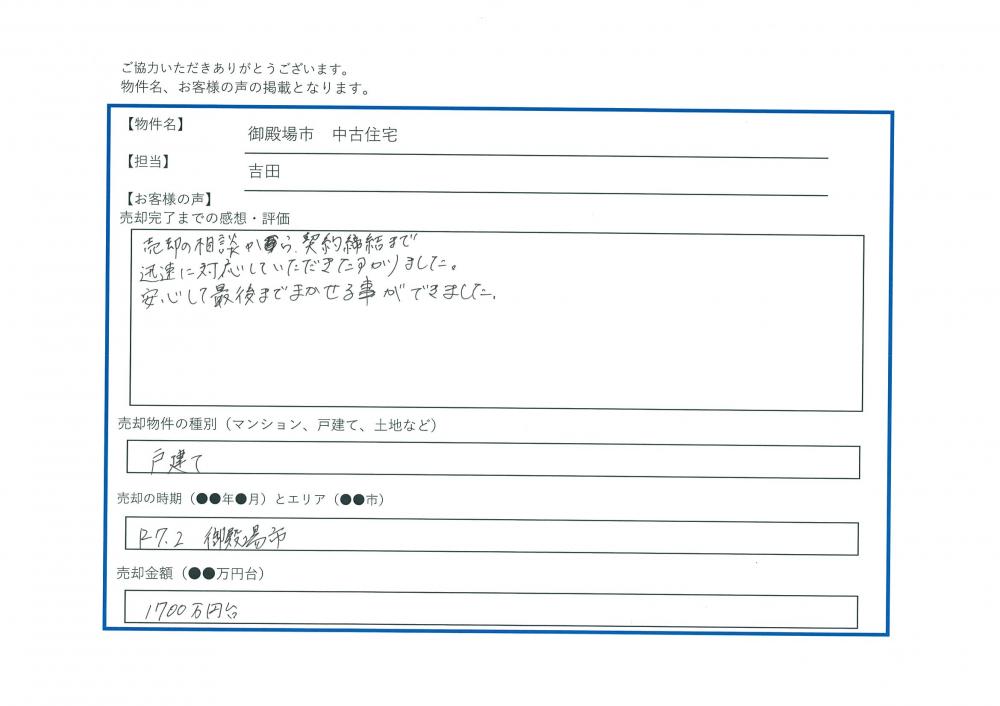 この度は、戸建てのご売却契約を頂きまして誠にありがとうございました。 無事お引渡しまで完了し、心よりお祝い申し上げます。 不動産査定サイト「SUUMO」より査定をご利用いただき、数ある不動産会社の中から、 専任媒介として弊社をお選び頂きありがとうございました。 敷地が広くリフォームもしてあり思い入れもあったかと思います。 さほどお時間もかからず価格変更せずにご成約のお手伝いができましたこと、嬉しく思います。 今後も不動産売買に関すること、 不動産売買後で気になることございましたらいつでも対応させて頂きます。