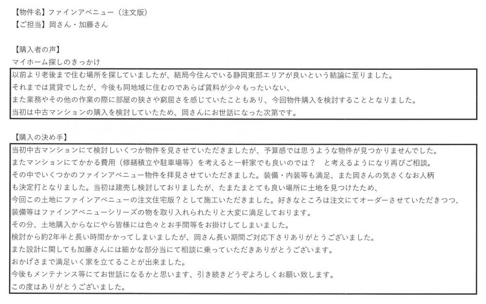 検討から約2年半と長い時間かかってしまいましたが、岡さん長い期間ご対応下さりありがとうございました。長泉町本宿のファインアヴェニューをご成約のお客様