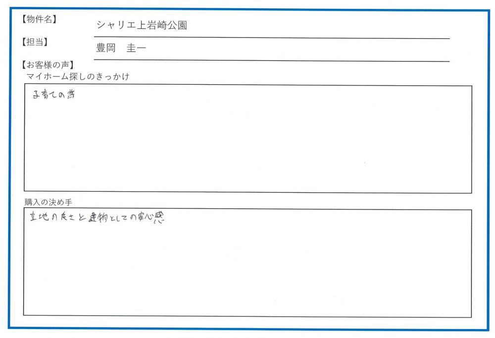 この度はマンションのご購入のお力になれて大変うれしく思います。小さなお子様と新しいお住まいで楽しそうに生活しているお姿が目に浮かびます。これから寒くなる季節ですのでお身体にお気を付けてお過ごし下さい。 また機会がございましたらお手伝いさせていただければと存じます。何卒よろしくお願い致します。