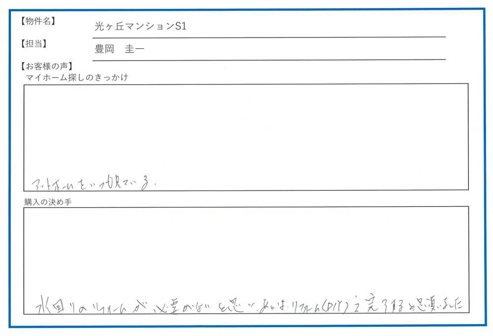 ご体調も回復し無事契約、お引渡しが出来たことを嬉しく思います。これから寒くなる季節ですのでどうかお身体をご自愛いただきますようお願い申し上げます。また機会がございましたらお声がけいただければと思いますので何卒宜しくお願い申し上げます。