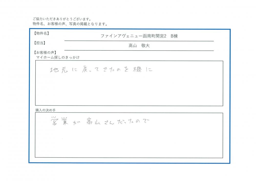 この度は、数ある住宅から「ファインアヴェニュー」をお選びいただき 誠に有難う御座います。 松井様とは楽しくやりとりをさせていただき、お会いするのが毎回楽しみでした。 また、松井様からのコメント。 身に余るお言葉を頂戴し、大変嬉しく思っております。 この度、お客様の大切な節目に関わらせていただけたことを心より嬉しく思っております。 今後とも末永く、どうぞよろしくお願い致します。