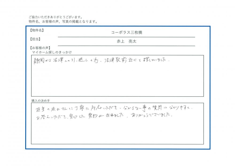分からない事の質問に分かりやすくお答えいただき、安心した契約が出来ました。沼津市のマンションをご成約のお客様